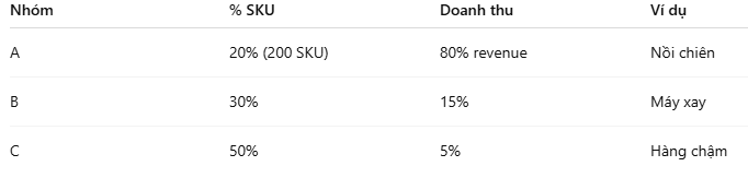 Lưu ý: Trong ví dụ này, giả định rằng phân bổ doanh thu tuân theo quy luật Pareto (20% SKU chiếm ~80% doanh thu). Trong thực tế, cần kiểm tra dữ liệu trước khi áp dụng giả định này. Ngoài ra, việc phân loại ABC không chỉ dựa trên doanh thu mà còn có thể cân nhắc thêm các yếu tố như biên lợi nhuận (margin), độ biến động nhu cầu (demand variability) hoặc vai trò chiến lược của SKU.